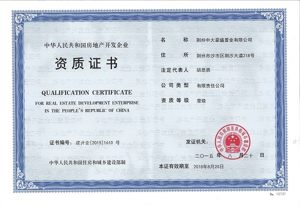 近日,中大豪盛地产集团母公司荆州中大豪盛置业有限公司喜领房地产开发企业一级资质证书,成为荆州唯一(湖北共28家)持一级资质的房地产开发企业。
