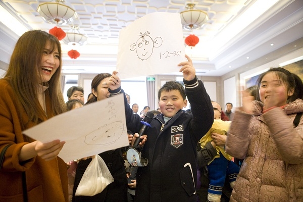 除了包汤圆、猜谜等常规活动外,还增加了“蒙眼画萌娃”亲子活动。家庭成员一人指点,一人作画,玩得不亦乐乎。