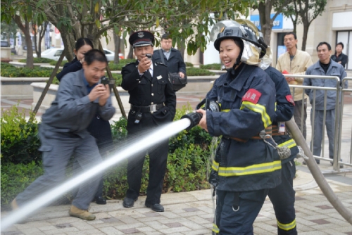 演示完毕后,不少业主穿上消防服,体验了一把消防水枪的使用方法。小业主也纷纷体验“灭火”,争当“救火小英雄”。