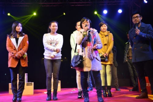台上嘉宾玩游戏乐不停,台下嘉宾也没闲着。一名年轻的个体老板相中一名女生,足足注视了她20分钟,才鼓起勇气上前聊天。后来,男生走上舞台,用话筒高声呼喊女生的名字,勇敢地吐出自己的心声。在主持人的鼓励下,两人在聚光灯下拥抱。