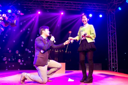 一名本是作为表演嘉宾登台的女生刚谢幕,一名男生就口含玫瑰冲上舞台。原本,他本是来凑热闹的,谁知被女生的演绎打动,于是上台单膝下跪送上玫瑰花,期望赢得女生的芳心。女生果真被他勇敢的举动所打动,答应互留联系方式,进一步接触。