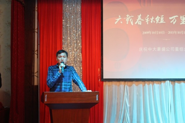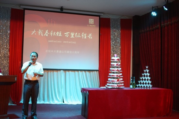 2015年10月10日,集团举办母公司中大豪盛置业有限公司(以下简称“中大豪盛公司”)重组六周年纪念活动,集团全体员工、物业公司和合作单位代表共百人参加。集团总经理王林,湖北日报传媒集团楚天房地产公司总经理、中大豪盛公司常务副董事长韦忠南莅临致辞。