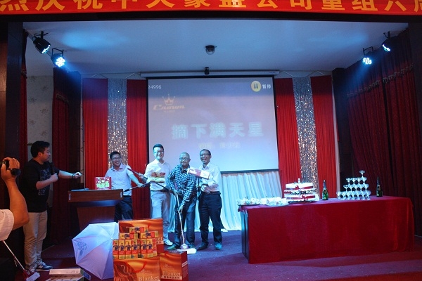 晚6:58分,活动开始,全体员工跟随一段PPT,通过建设销售、荣誉奖项、企业文化、亮点活动和醉美景致五个篇章,回顾了企业发展历程。4名新员工围绕“六载春秋短,万里征程长”这一活动主题进行诗朗诵,表达了共创事业的决心和期待。在《祝你生日快乐》的歌声中,集团领导携手上台点燃生日蜡烛、开启香槟,共同祝愿。