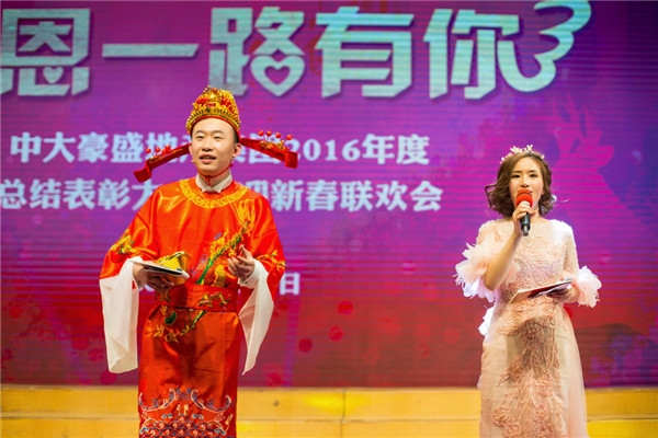 2016年,感恩一路有你;2017年,我们携手前行。2017年1月20日,农历丙申年腊月二十三,主题为“感恩一路有你”的荆州中大豪盛地产集团2016年度总结表彰暨迎新春联欢会隆重举行,集团全体员工及家属、物业公司和合作单位的代表共近300人参加。湖北日报传媒集团楚天房地产公司总经理、中大豪盛副董事长韦忠南一行专程莅临。