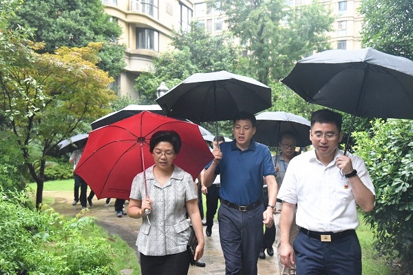 当日上午9:30许,天降大雨,考察团驱车来到佳园,首先进入楚天都市营销中心,结合沙盘模型听取了集团对小区规划、建设和物业方面的全面介绍,对小区整体情况有了直观了解。随后,一行人深入园区参观,看实景、问设计、谈管理,对佳园丰富繁茂的绿化景观、人文舒适的居住环境、温馨细致的物业服务等给予高度赞许。