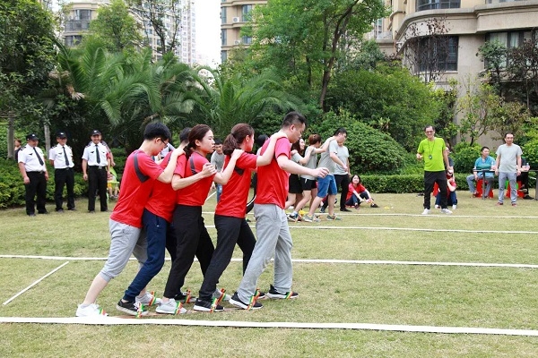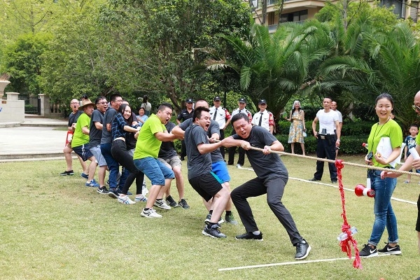 “毛巾扣脸“由一人抛毛巾,一人用脸接毛巾,着实让大家好好活动了一把颈椎和腰身;“同舟共济”由5名队员穿同一双板鞋前进,是考验团体配合的项目,备战充分的“猛虎队”勇夺头魁;拔河项目中,强壮彪悍的“火影队”占据优势,以摧枯拉朽之势毫无悬念地拔得头筹。