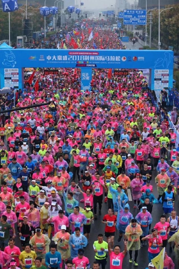 尽管当日秋风飕飕,秋雨绵绵,但却丝毫未能阻挡跑友们的热情。天刚蒙蒙亮,荆州静谧的大街小巷里就到处穿梭着身着玫红色衣服的跑友,默契地向荆州体育中心集结聚拢。早上7点,起点处的两万人玫红色大军绵长数里,人声鼎沸,旌旗飘舞。随着活动的开始,这份不惧风雨勇于挑战的激情点燃了整个荆州,进而传向世界。