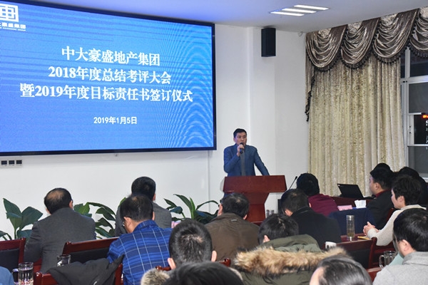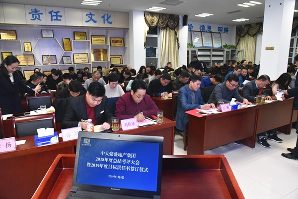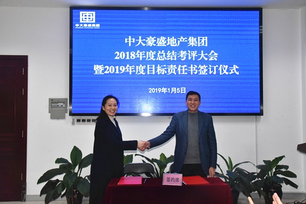 2019年1月5日,中大豪盛地产集团2018年度总结考评大会暨2019年度目标责任书签订仪式在一楼培训中心举行,集团全体员工和物业公司代表共近120人参加。