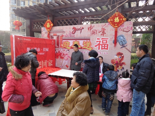 客服人员中午就开始忙碌,搬桌子,准备笔墨纸砚,布置活动现场背景,做好书写春联的前期准备工作。下午2时,写春联活动在佳园一期A标段正式开始。
