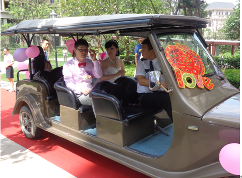 14点15分新人抵达小区,客服人员列队欢迎并送上新婚祝福,保安随后开礼车热情相送。