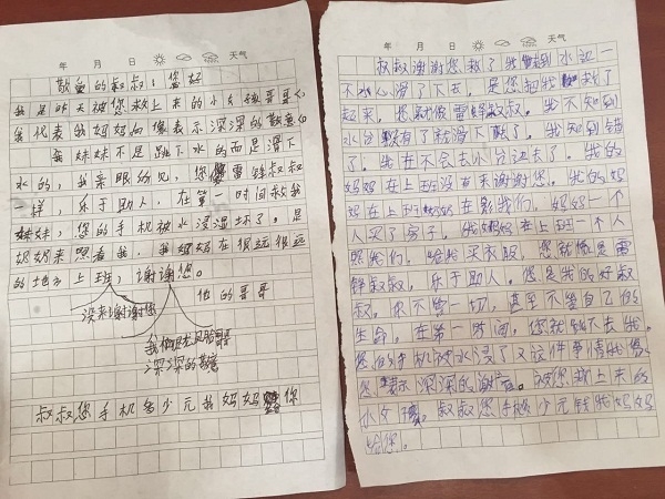 在物业服务中心,小女孩和哥哥每人都给了雷赛一封信。懂事的他们在信中询问雷赛的手机多少钱,“我妈妈给您”。