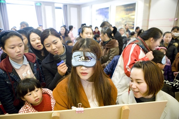 除了包汤圆、猜谜等常规活动外,还增加了“蒙眼画萌娃”亲子活动。家庭成员一人指点,一人作画,玩得不亦乐乎。