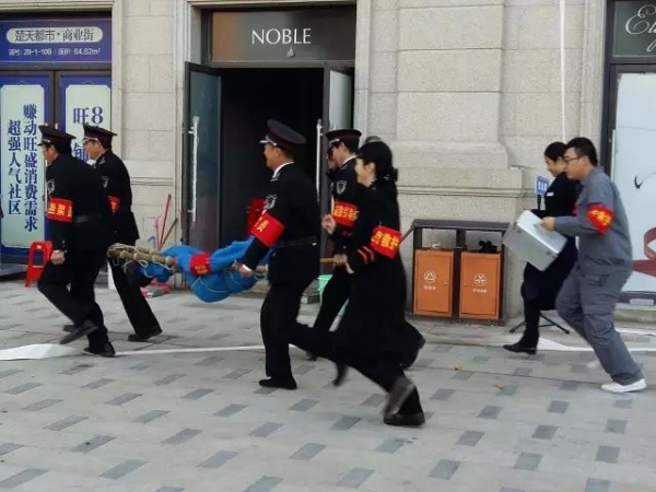 最激烈的当属应急演练。前3个环节完毕后,临街一栋商铺三楼平台冒出烟雾,串起火苗,惹得观摩人员阵阵惊呼。物业工作人员迅速实施灭火救援,一组负责疏散现场群众,确保消防通道畅通;一组穿上防护服戴上头盔,找到“火源”对被困人员实施救援……很快,救援人员抬着“伤员”安全撤离,火源得到有效控制。逼真的氛围、有序的分工、熟练的技能、专业的救助,让在场人员赞叹不已。