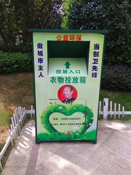 这些衣物捐赠箱分别位于5栋旁的小广场上、13栋楼前和物业服务中心门口,由物业联合“湖北好人”雷体勇的爱心工作站设置。爱心工作站会对公众捐赠的衣服进行整理,然后送给贫困家庭或儿童。