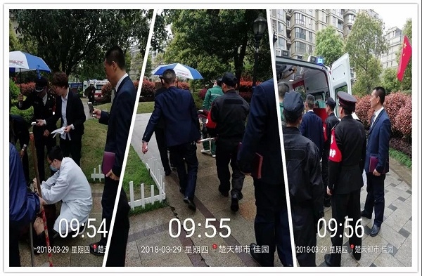 有惊无险的事不止这么一件。3月29日上午9点多,天空飘雨,佳园13号楼一名大妈突然晕倒在园区小路上,神志不清。佳园物业服务中心秩序维护部、应急分队和管家接到呼叫后迅速赶到现场,有的拨打120急救电话,有的脱下外套给她盖上,有的撑伞,有的想办法弄清身份联系大家。大家分工合作,很快将大妈抬上救护车送往二医救治。