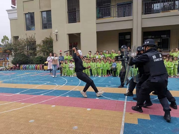 当日上午9时,演习正式开始。队员们通过情景再现的形式,向师生们生动展现了针对不同突发情况的处理方式。在防暴演示环节,戴着面具的坏叔叔闯入校园,被应急队员及时发现并合力制服,老师们将幼儿转移到安全地带并镇定安抚,直到坏人被带离;在消防演示环节,当火警警报响起,应急队员迅速利用消防器械处理火情,各班老师带领幼儿拿起湿毛巾捂住口鼻,弯腰小步快走撤离至操场……