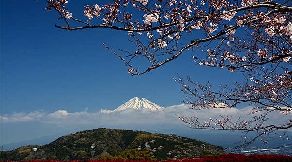 富士山是一座终年积雪的活火山,海拔3776米,山上气候变化多端,是日本自然景观的代表。启程观光时,山下艳阳高照,山上雪花飞舞,未能一睹全貌。没想到返程时天高气朗,得以在静岗停车场拍得一张以富士山为背景,以樱花为近景的照片,弥补了遗憾。